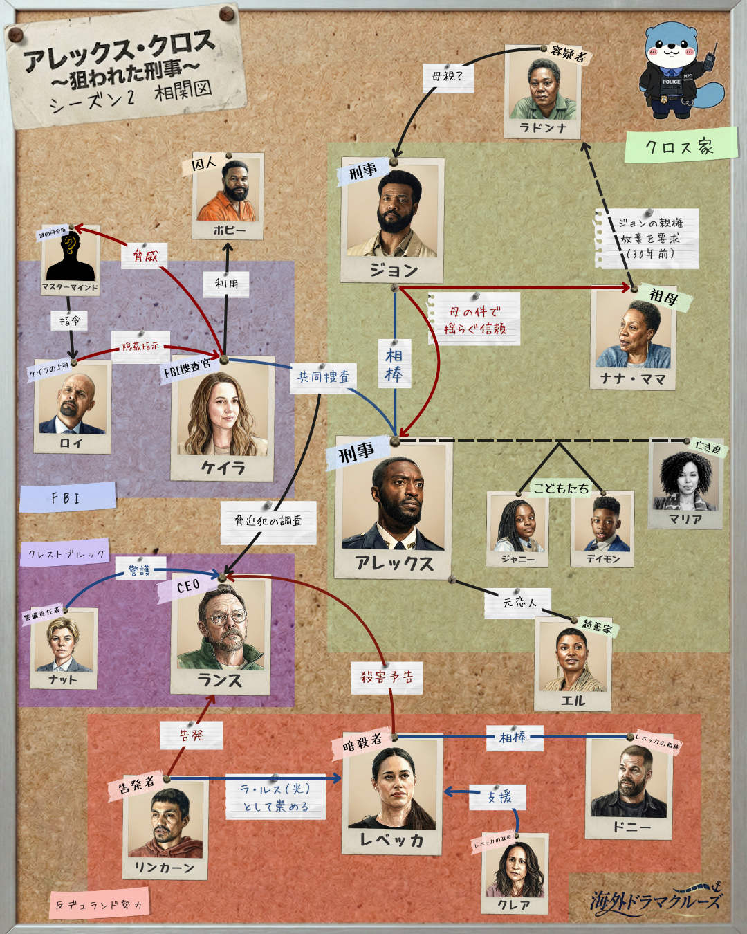 - 名前の由来(原作とのリンク): 原作小説におけるアレックス・クロスの宿敵にして最大のヴィランは「カイル・クレイグ(Kyle Craig)」というFBI捜査官です。ドラマ版の「ケイラ(Kayla)」は、このカイルの性別変更キャラクター、あるいは娘などの血縁者である可能性が高く、彼女が味方のふりをしてアレックスを利用しているという展開は、原作へのオマージュとして十分に考えられます。